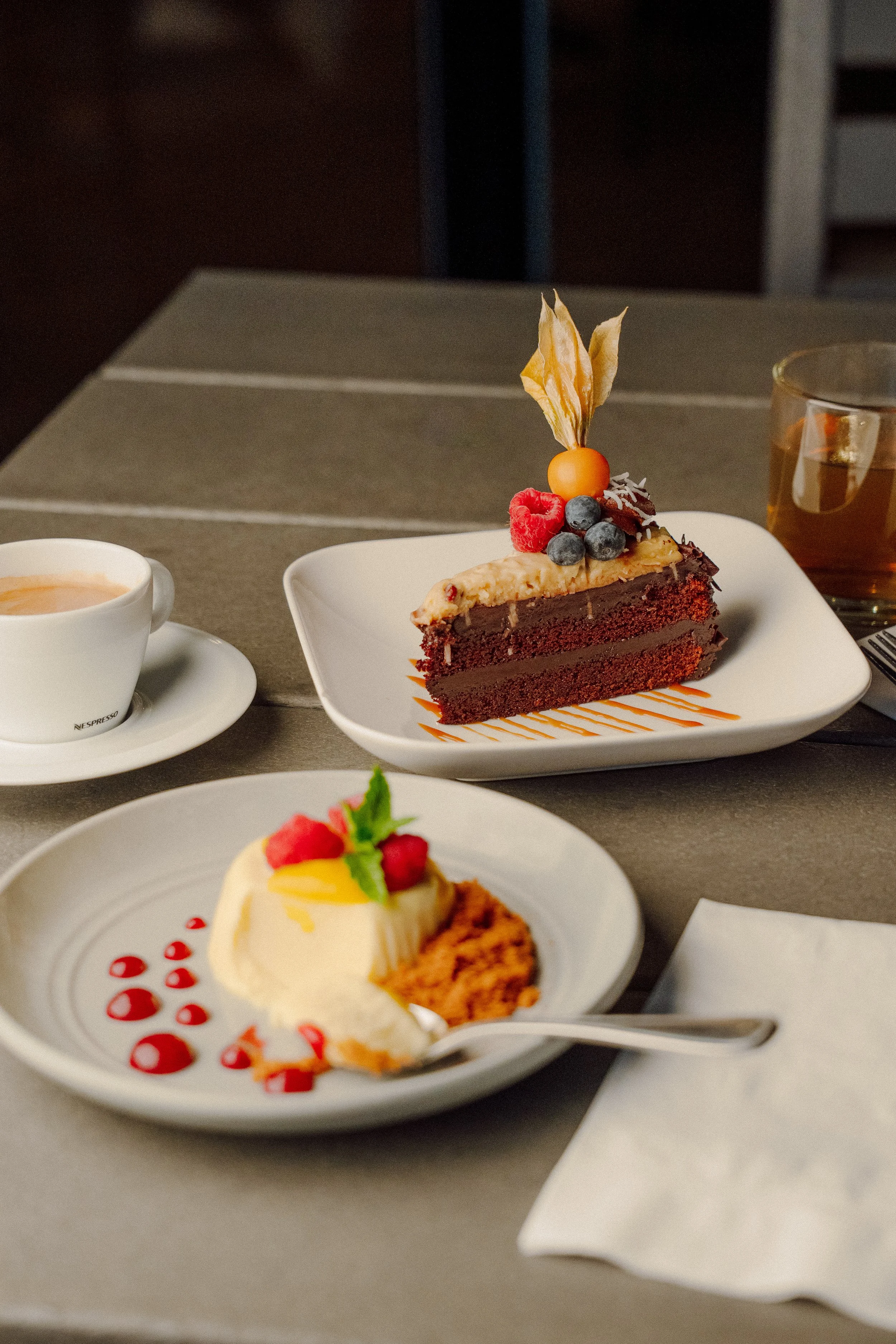 rich gluten-free cake, plant-based chocolate, seasonal garnishes
